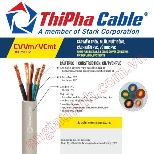 Cáp mềm tròn 5 lõi, ruột đồng, cách điện PVC, vỏ bọc PVC Thịnh Phát – VCmt