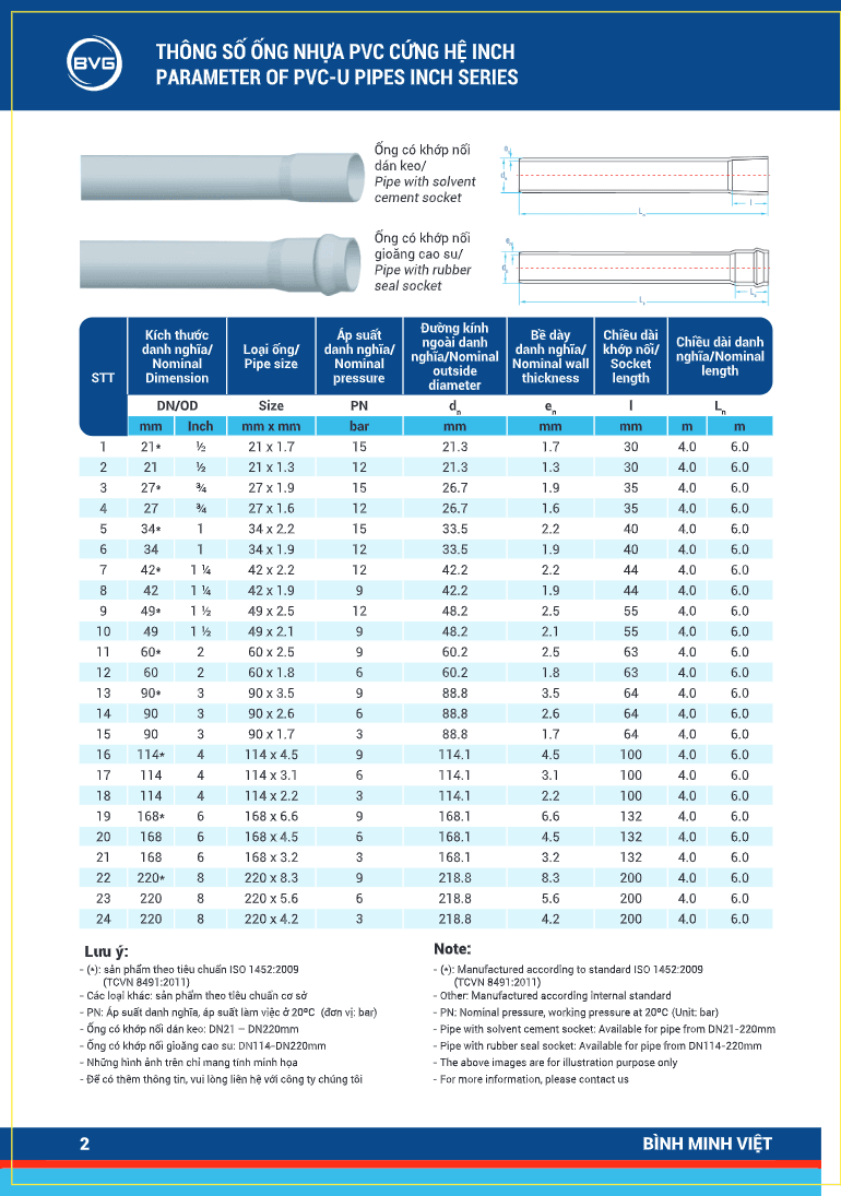 THÔNG TIN KỸ THUẬT ỐNG UPVC HỆ INCH