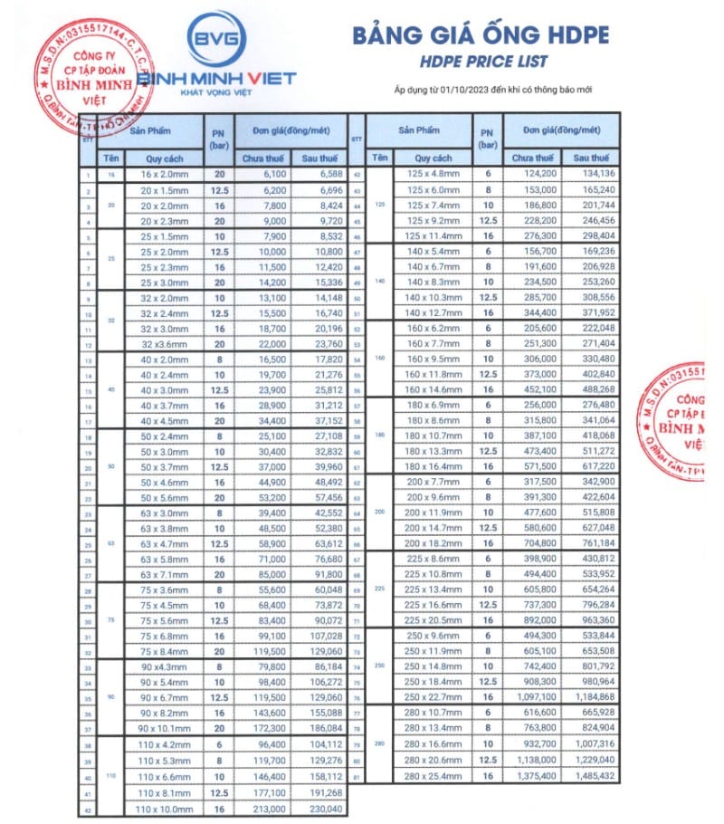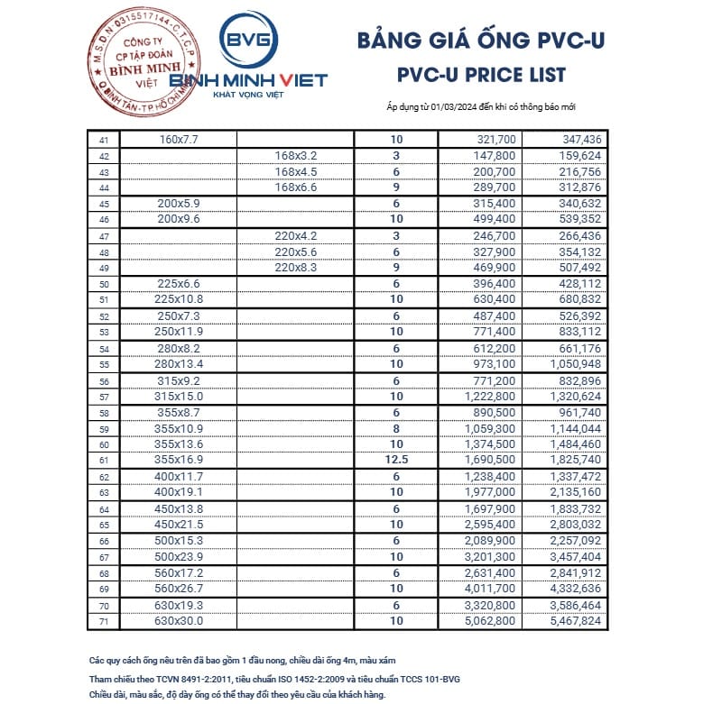 BẢNG GIÁ ỐNG NHỰA BÌNH MINH VIỆT BVG