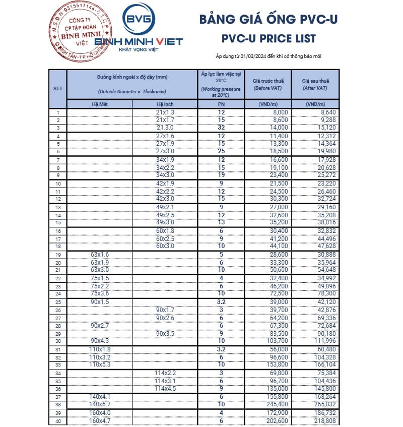 BẢNG GIÁ ỐNG NHỰA BÌNH MINH VIỆT BVG